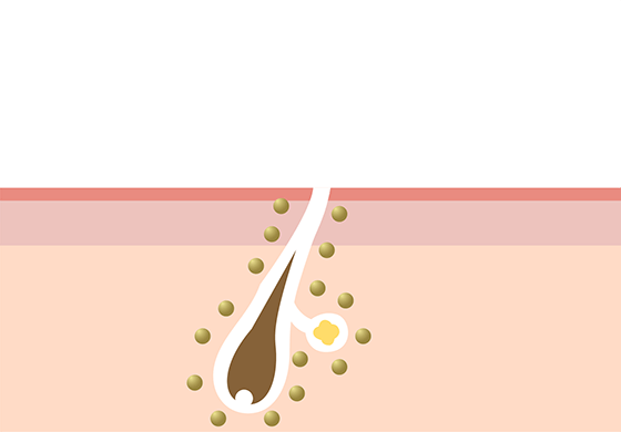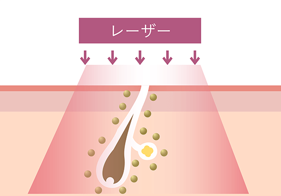 レーザー照射により、皮下に浸透した金の微粒子の温度を高め、皮脂腺にダメージを与えます。